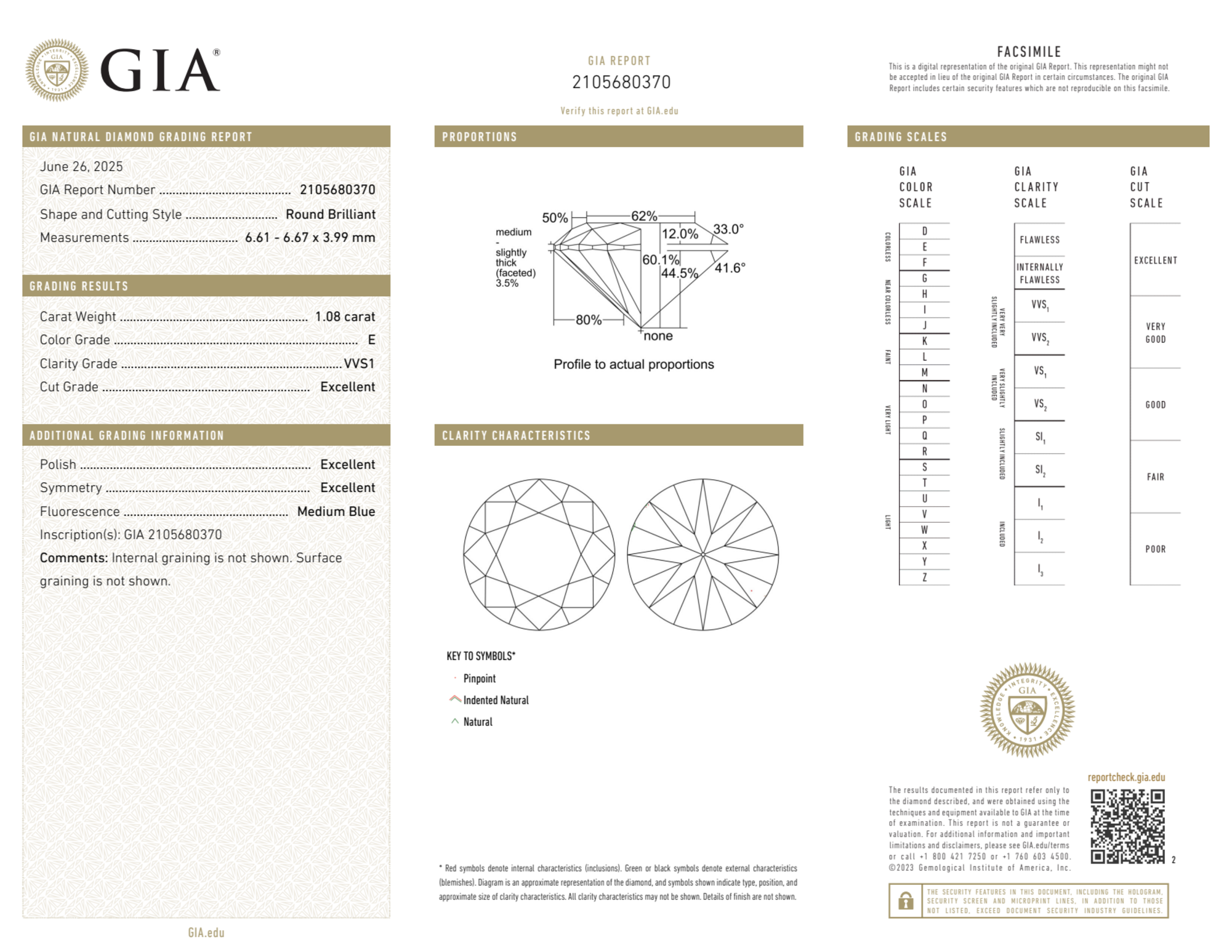 Your 1.08 carat Round natural diamond is graded E color (Colorless), and you can read more about E color diamonds here.