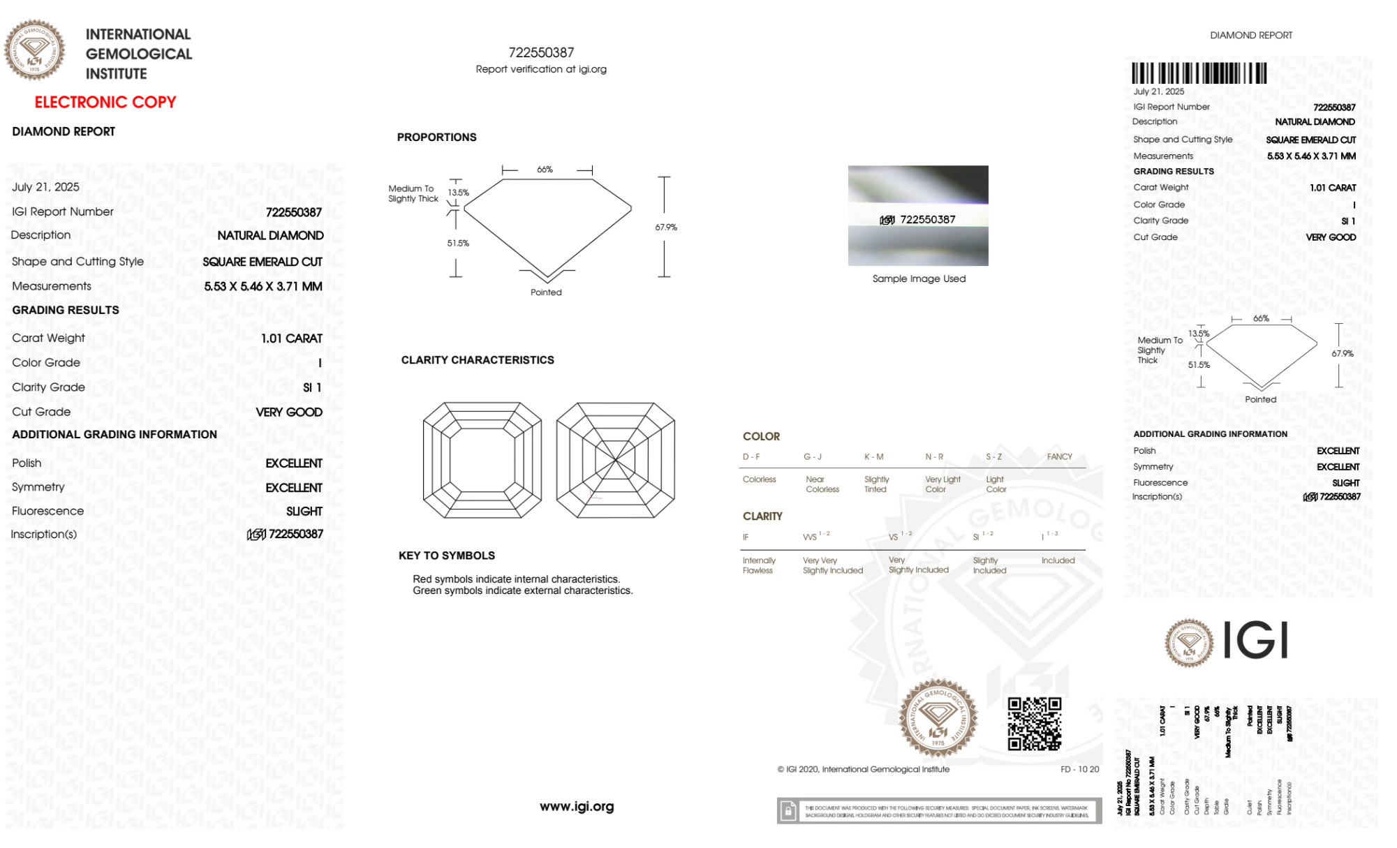 Your 1.01 carat Asscher natural diamond is graded SI1 clarity, which stands for Slightly Included 1. Read more about SI1 clarity diamonds here, or learn more about diamond clarity in general here.